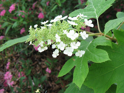 The oakleaf hydrangea is just starting to flower..I just love these white spikes in full bloom! My plant has taken several years to establish but well worth the wait.